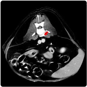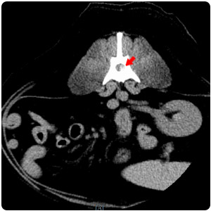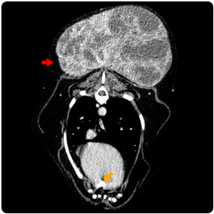 脊椎旁腫塊(黃)、脾腫塊(紅) |