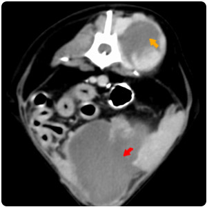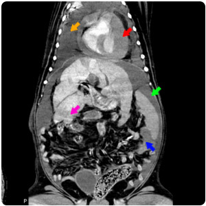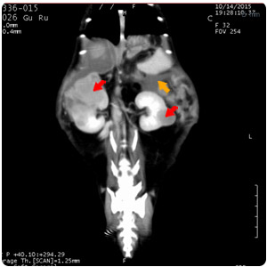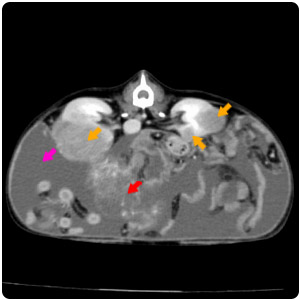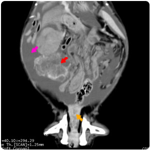 腹水(紫)、腹部腫塊(紅)、腎臟腫塊(黃) |