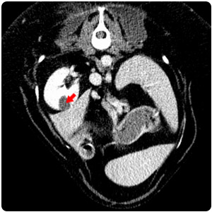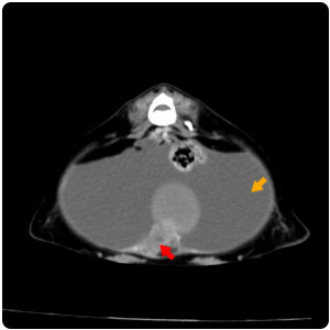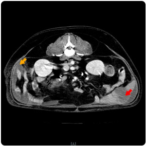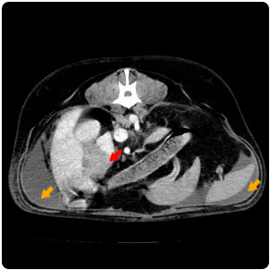 | 腎臟腫塊(紅)、腹水(黃) |